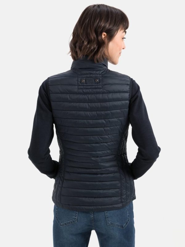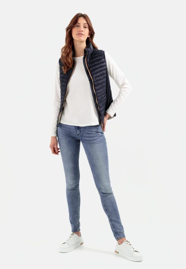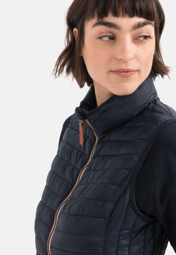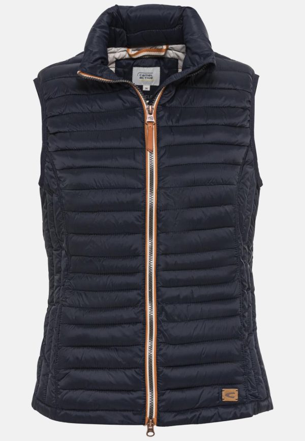 Mit einem durchdachten Materialmix schützt diese Steppweste vor kühlem und unangenehmem Wetter. Der Oberstoff besteht zu 100% aus recycletem, wasserabweisenden Polyamid. Die daunenfreie Fütterung der Steppkammern und der hochstellbare Kragen halten Wind und Wasser zusätzlich ab. Die Weste schließt bis zum Kragenabschluss mit einem Zwei-Wege-Reißverschluss. Durch die leicht taillierte Passform ist ein guter Sitz gewährleistet. Über dem Saum befindet sich ein camel active Logo-Detail aus Leder.