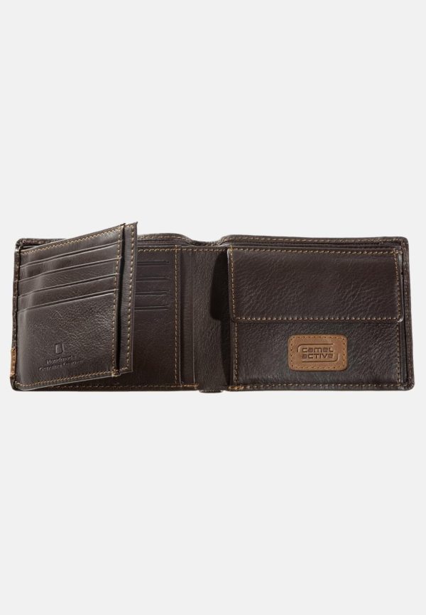 Geldbörse im Querformat mit Klappe aus 100% Leder. Die Börse ist wie folgt aufgeteilt: 8 Scheckkartenfächer, 5 Steckfächer, 1 Netzfach, 1 Sicherheitsfach mit Reißverschluss, 2 Scheinfächer, 1 Münzfach.
